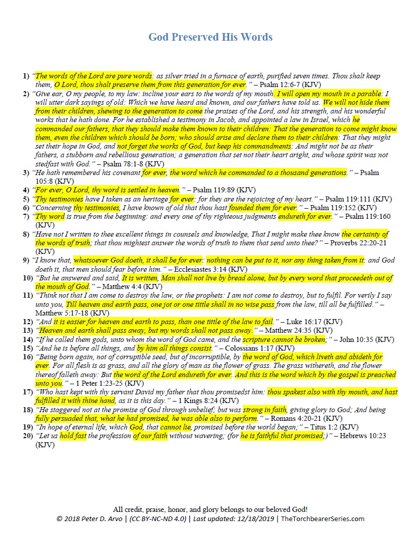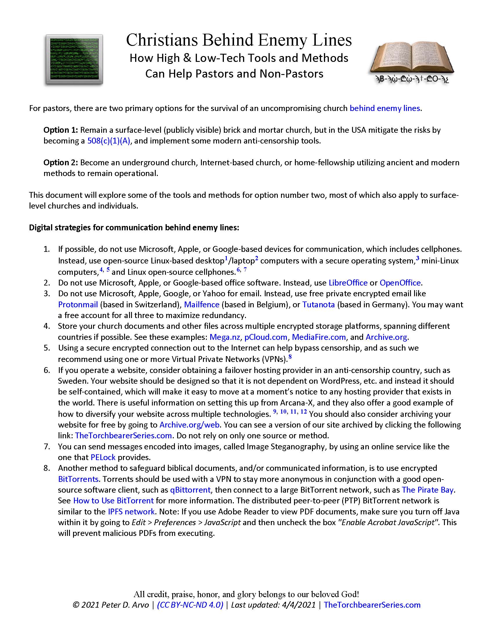 Because the most accurate Bibles and information about the lineage of those Bibles is being restricted in more and more countries, we strongly encourage everyone to copy and disseminate our content that is registered under (CC BY-NC-ND 4.0) in accordance with the simple rules set forth in the Copyright Notice File (Note: Most, but not all content is under (CC BY-NC-ND 4.0)). It is very important to get this information into the hands of those who are seeking answers, so that they may have stronger faith, trust, and love for our beloved Lord Jesus Christ! If you are an non-worldly uncompromising pastor, always be prepared to move your church to diversified house churches. If you are not a pastor, consider creating, coordinating, and facilitating your own home-fellowship or Internet-based church (see the How-to area for details).